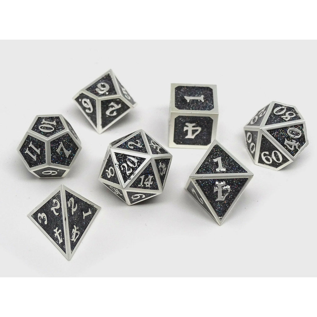 Our Heroic Dice of Metallic Luster Series is a line of bordered metal polyhedral dice with glittering and sparkling designs on each dice.  These 7 piece dice sets include one D20, D12, D10, D8, D6, D4, and D00 percentile dice.